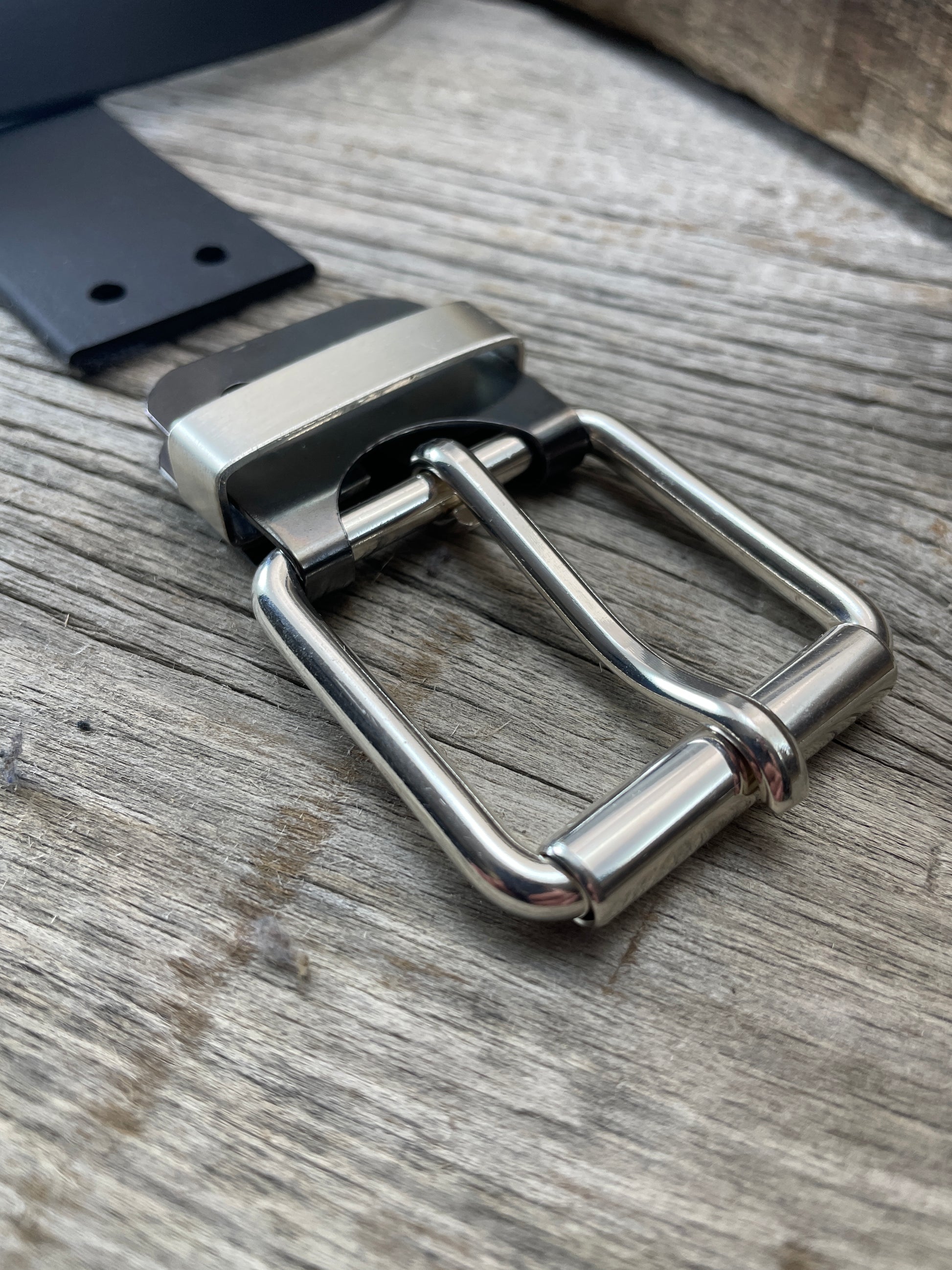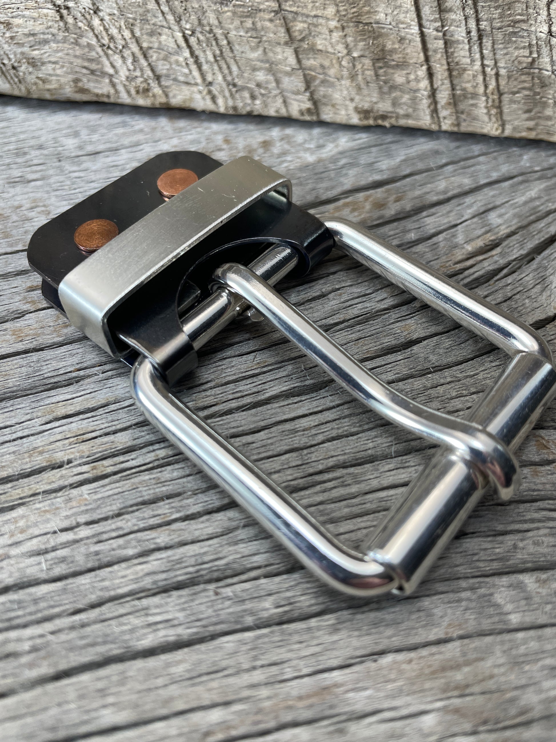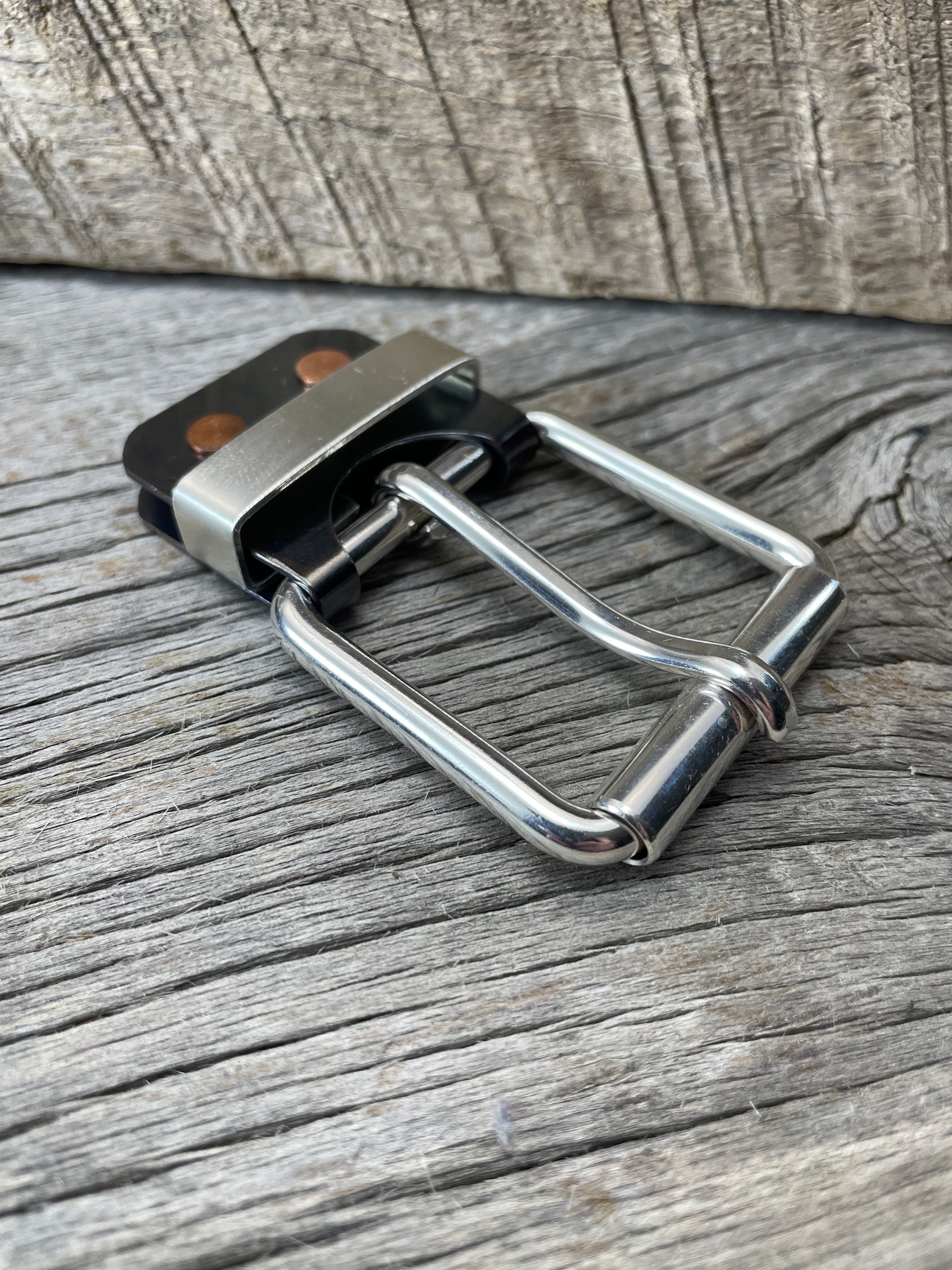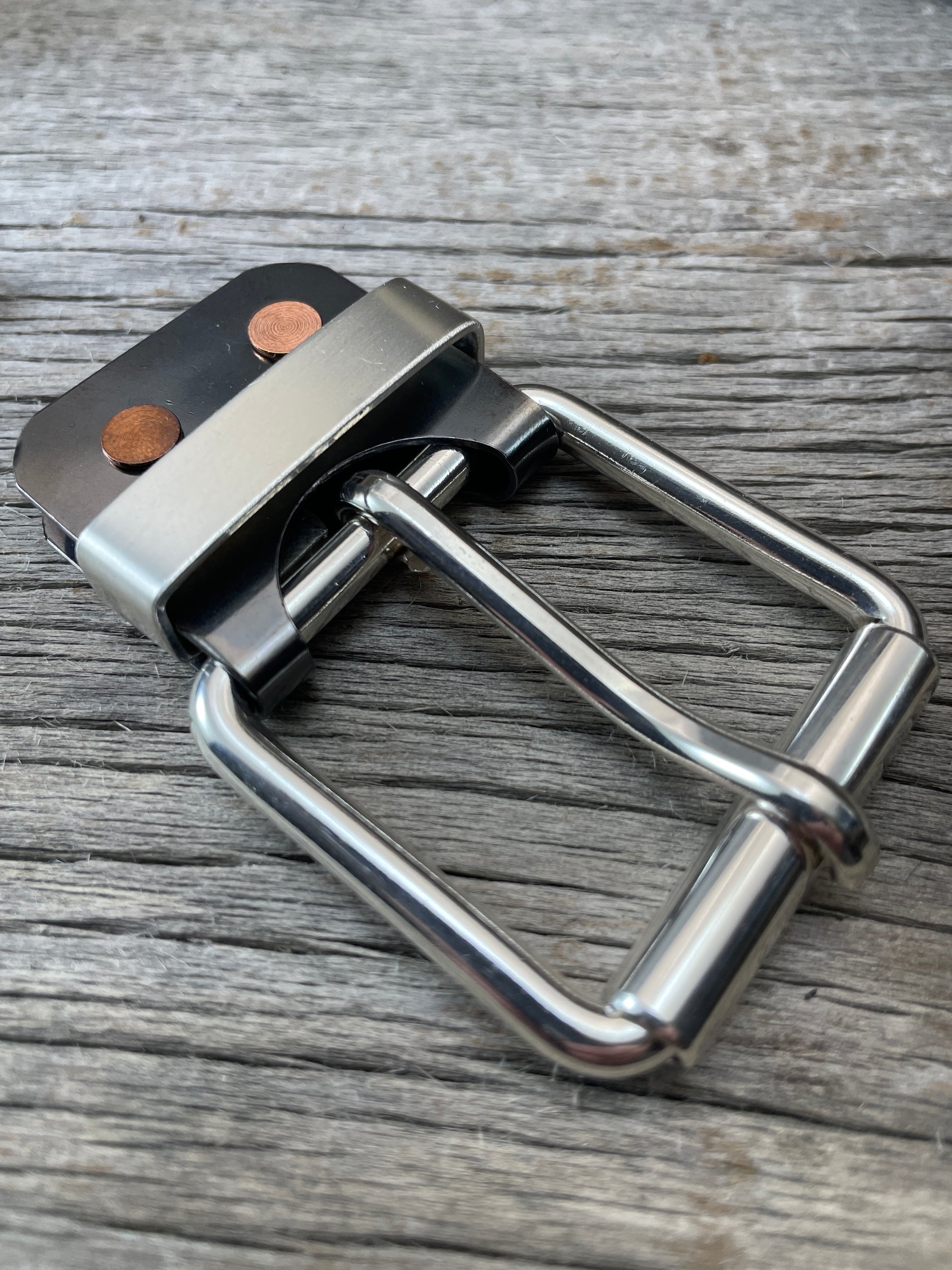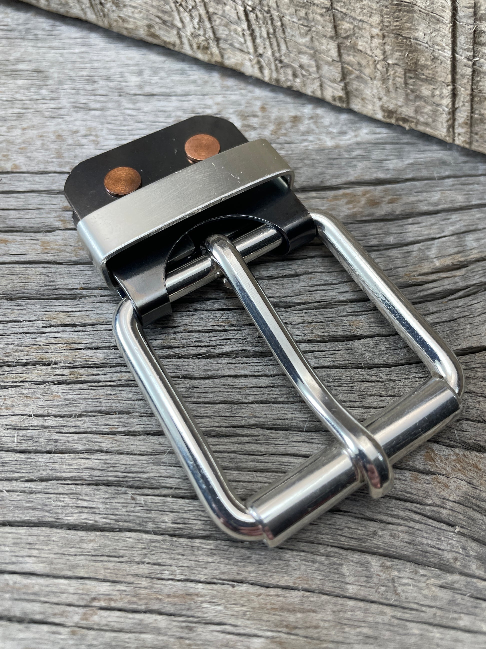 The roller buckle mounts to a belt-plate with a keeper inserted on the belt plate, fastened with Chicago screws. No stitching. No failure points. The result is a lower profile with increased comfort and flexibility. Its hinge function allows the buckle to move with the body, making it a very comfortable belt and buckle combination.