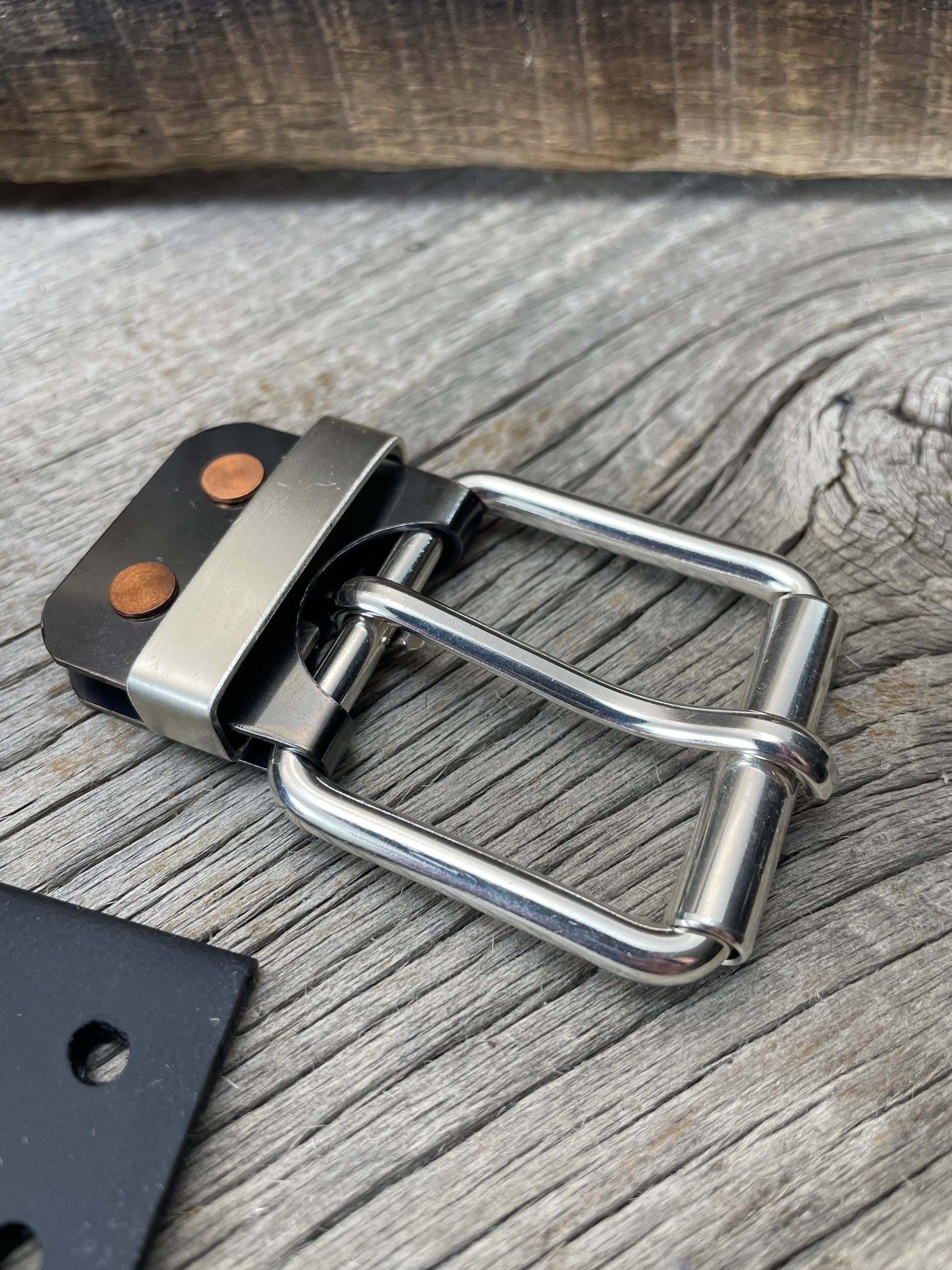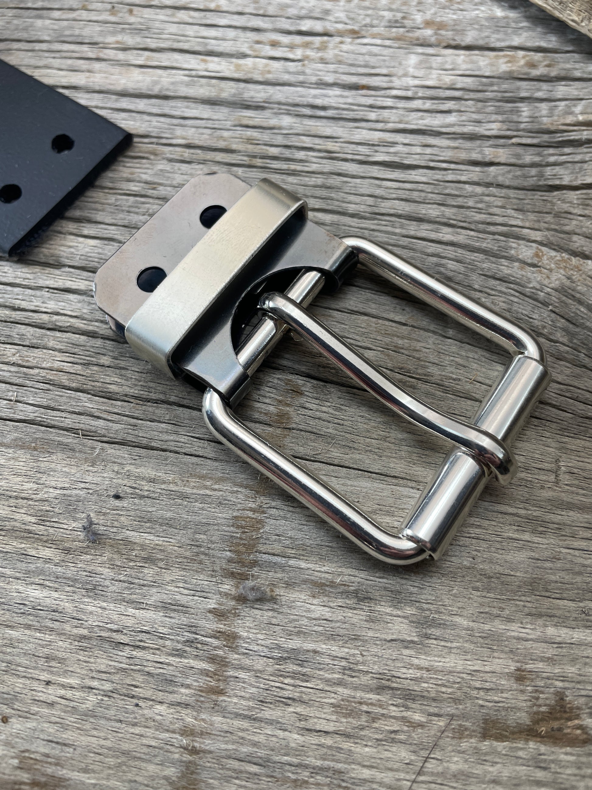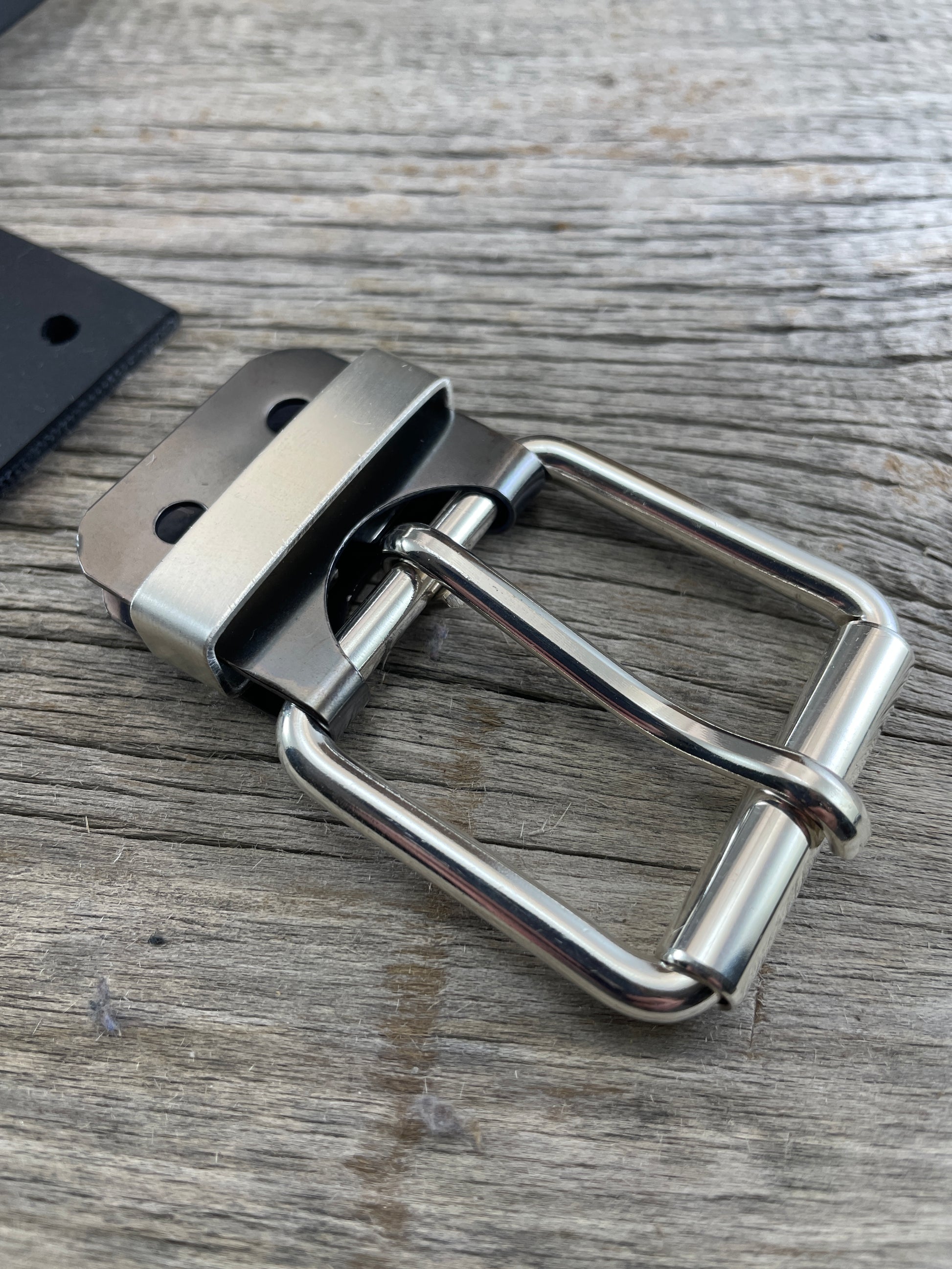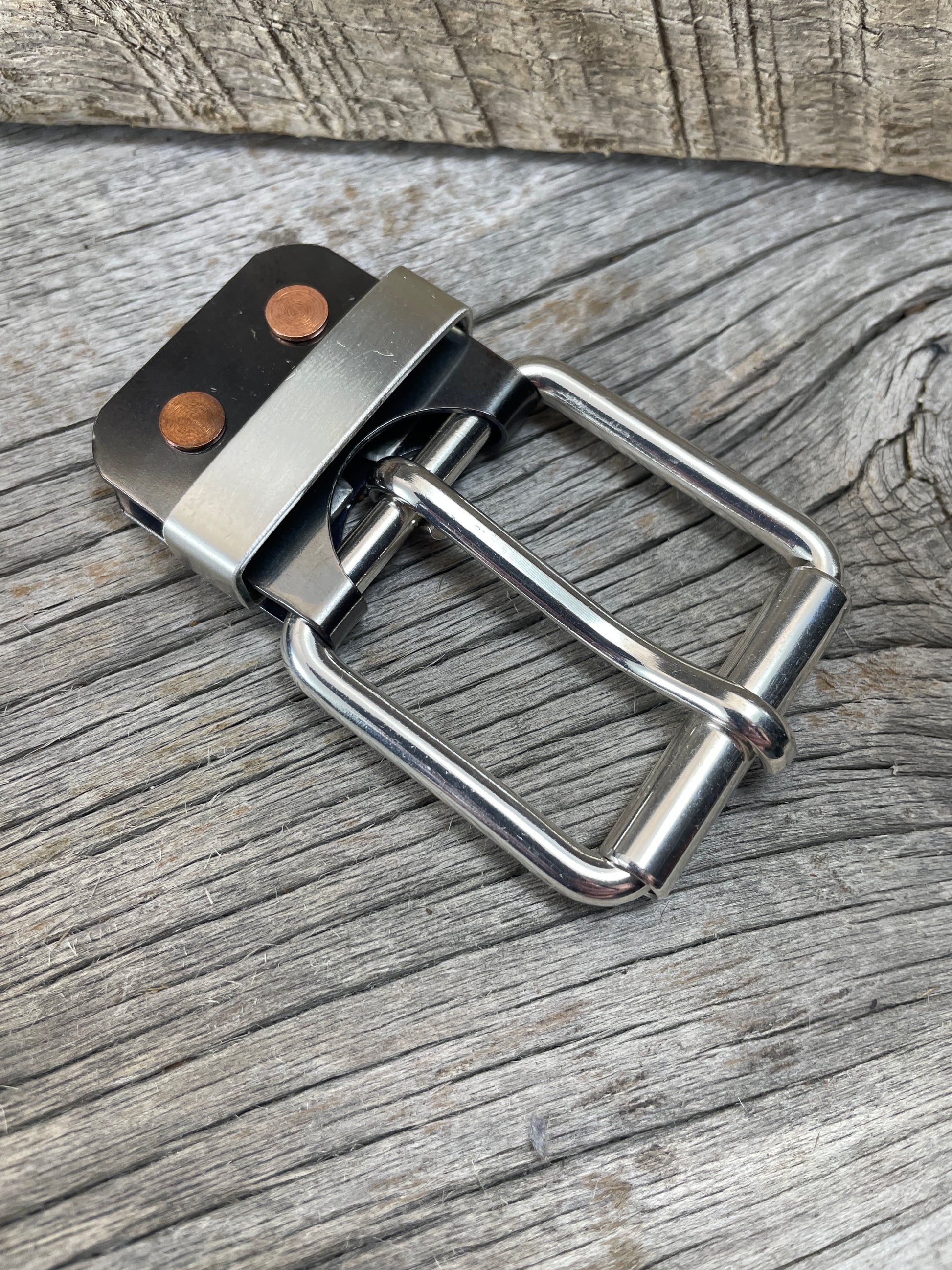 The roller buckle mounts to a belt-plate with a keeper inserted on the belt plate, fastened with Chicago screws. No stitching. No failure points. The result is a lower profile with increased comfort and flexibility. Its hinge function allows the buckle to move with the body, making it a very comfortable belt and buckle combination.