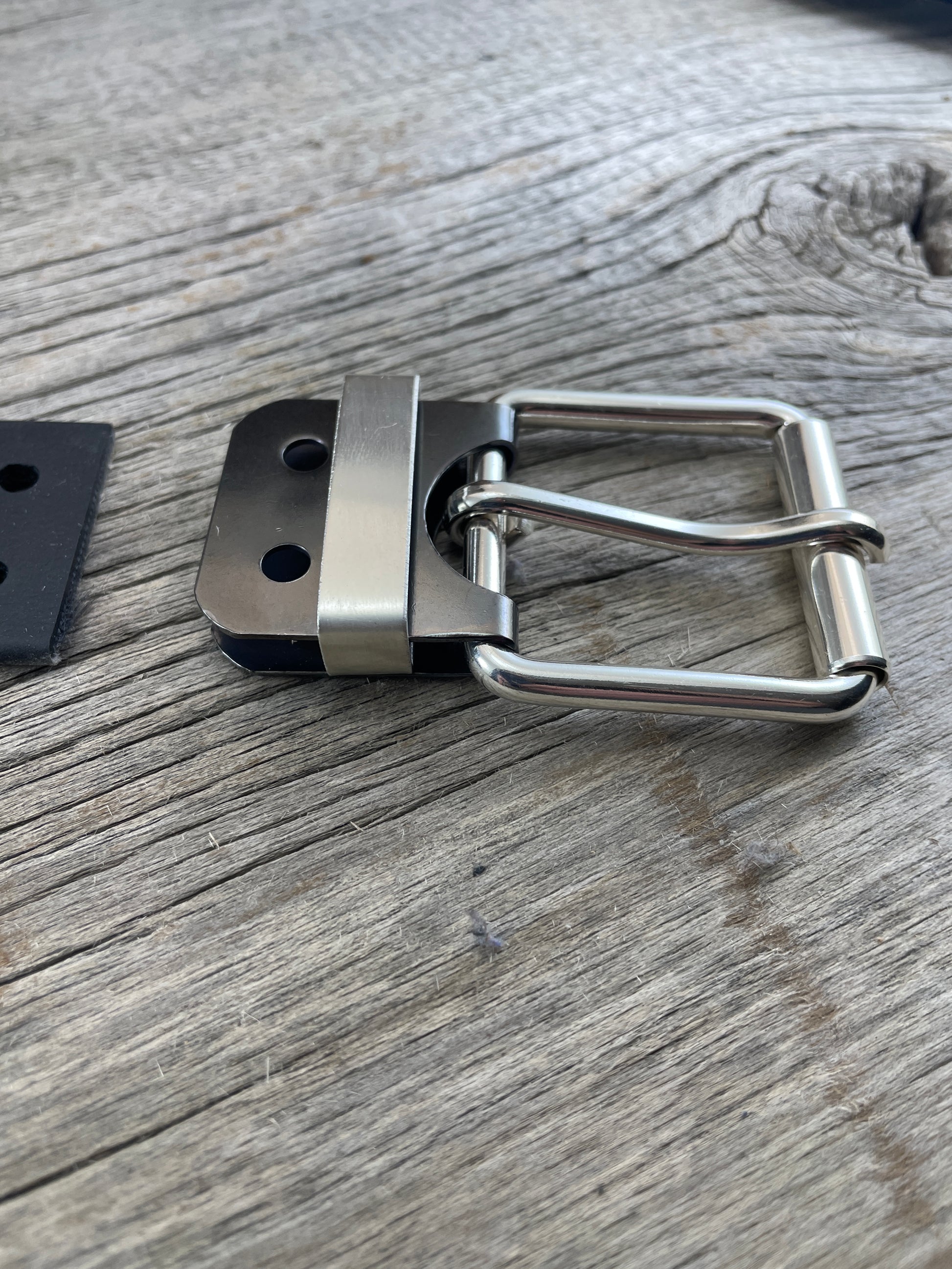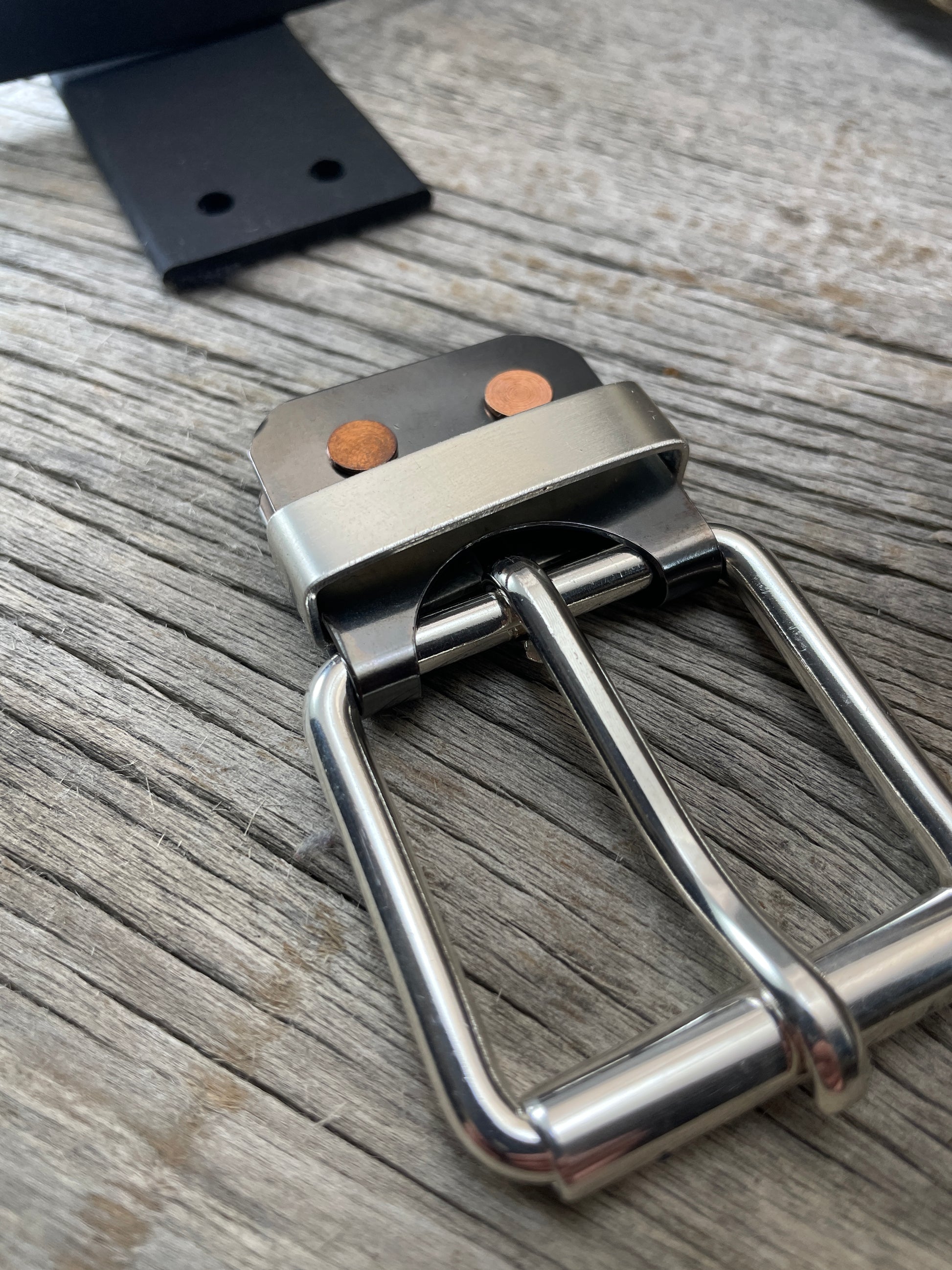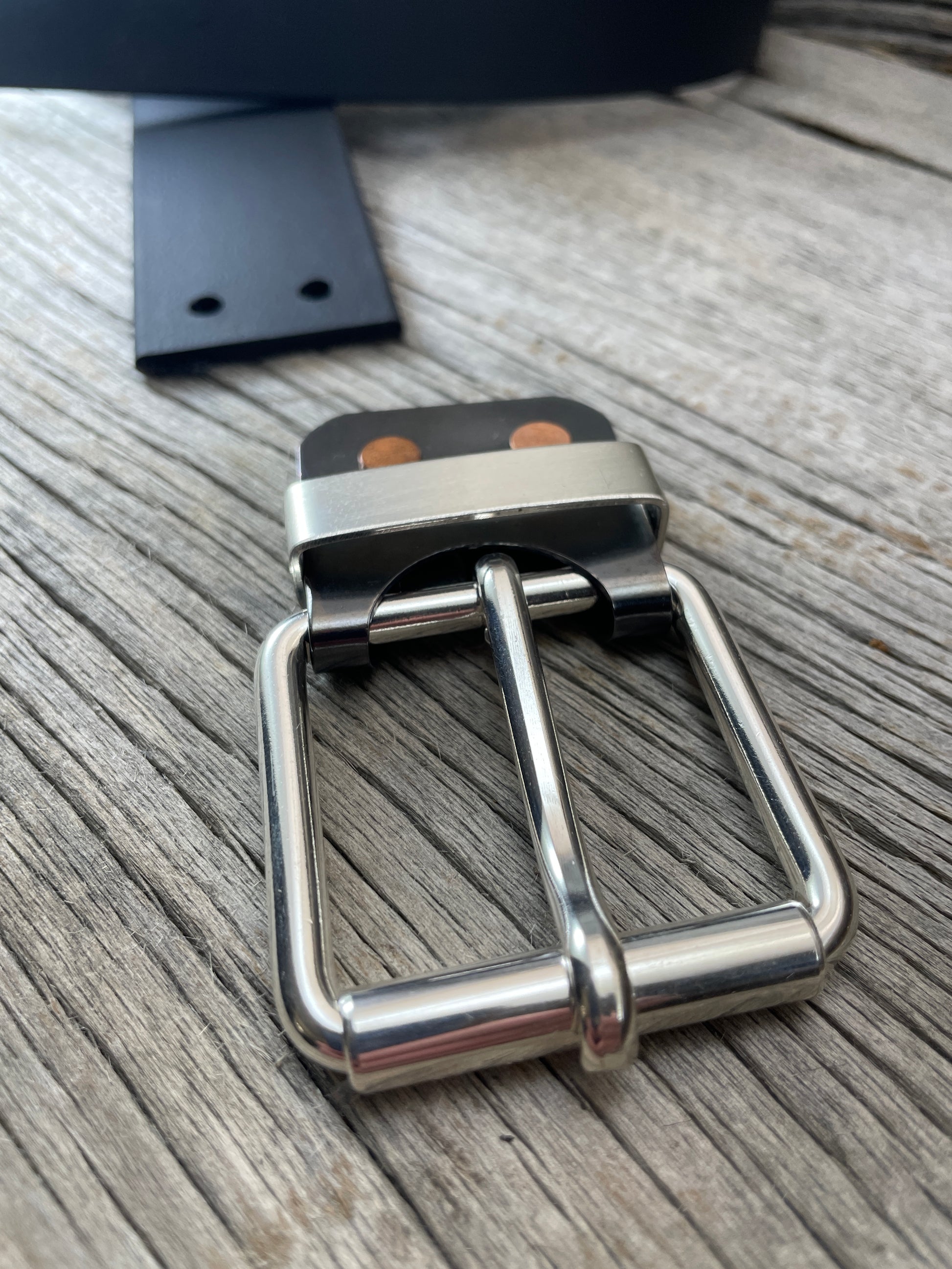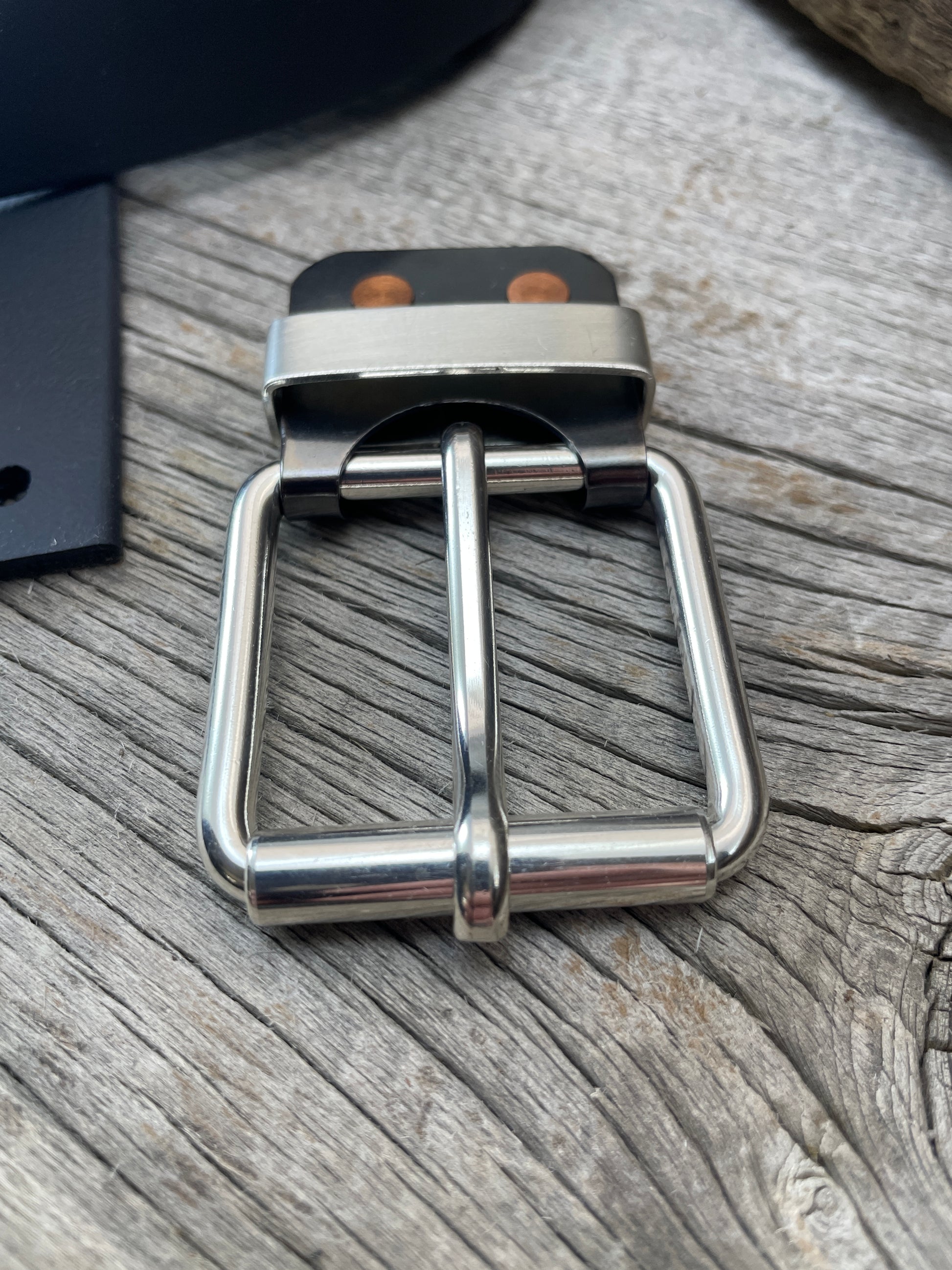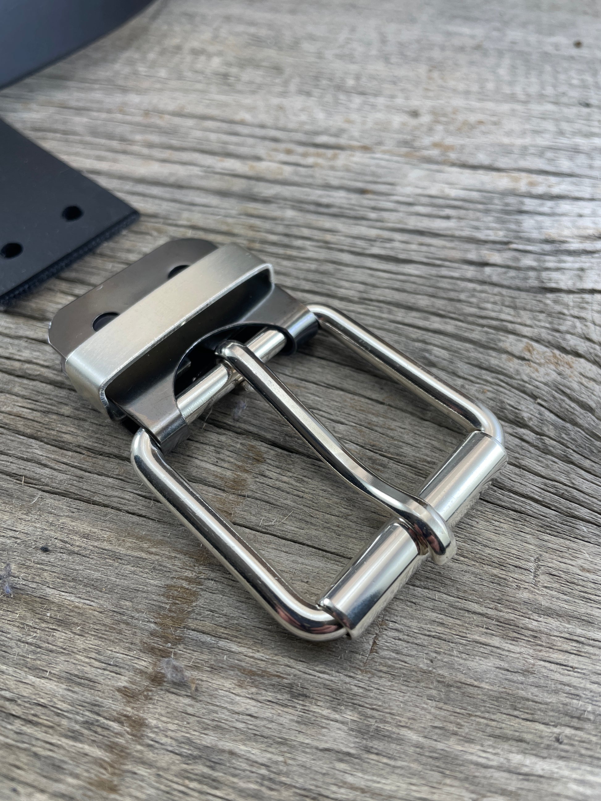 The roller buckle mounts to a belt-plate with a keeper inserted on the belt plate, fastened with Chicago screws. No stitching. No failure points. The result is a lower profile with increased comfort and flexibility. Its hinge function allows the buckle to move with the body, making it a very comfortable belt and buckle combination.