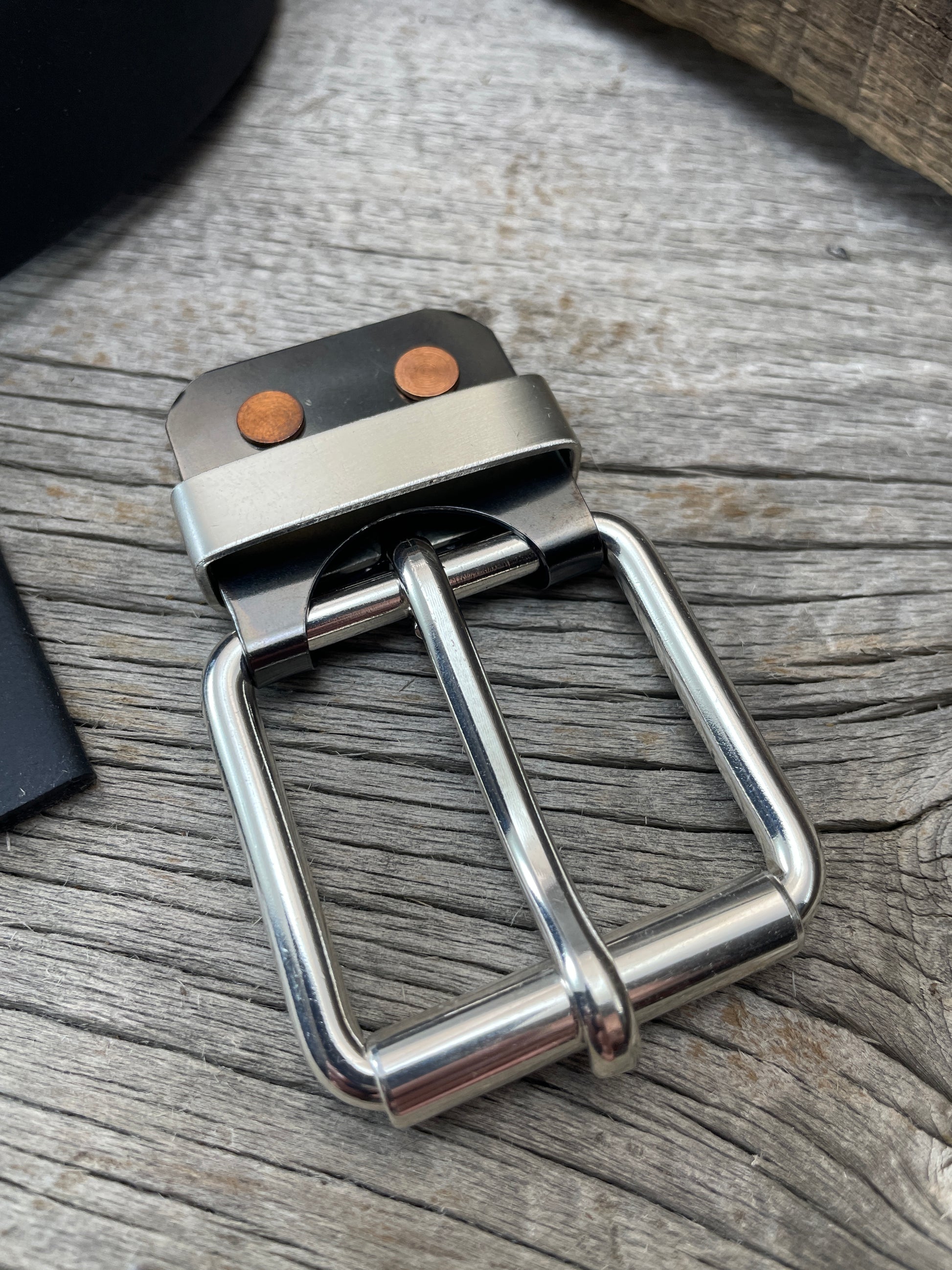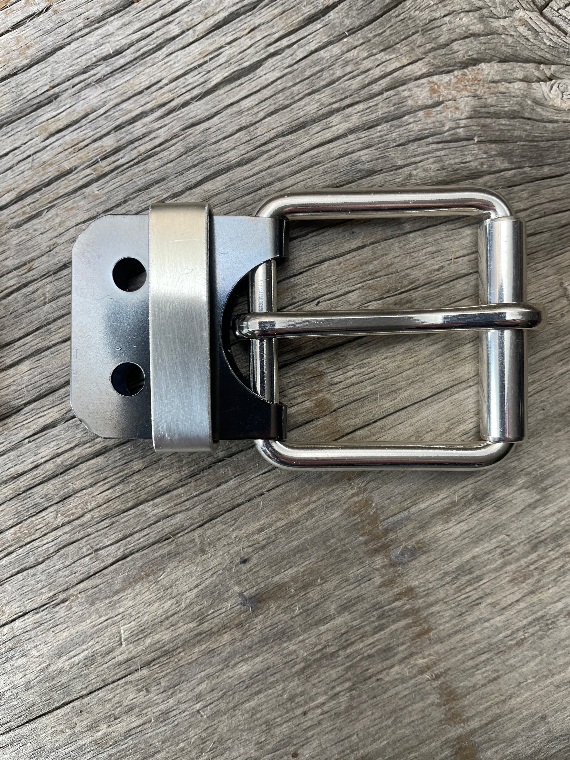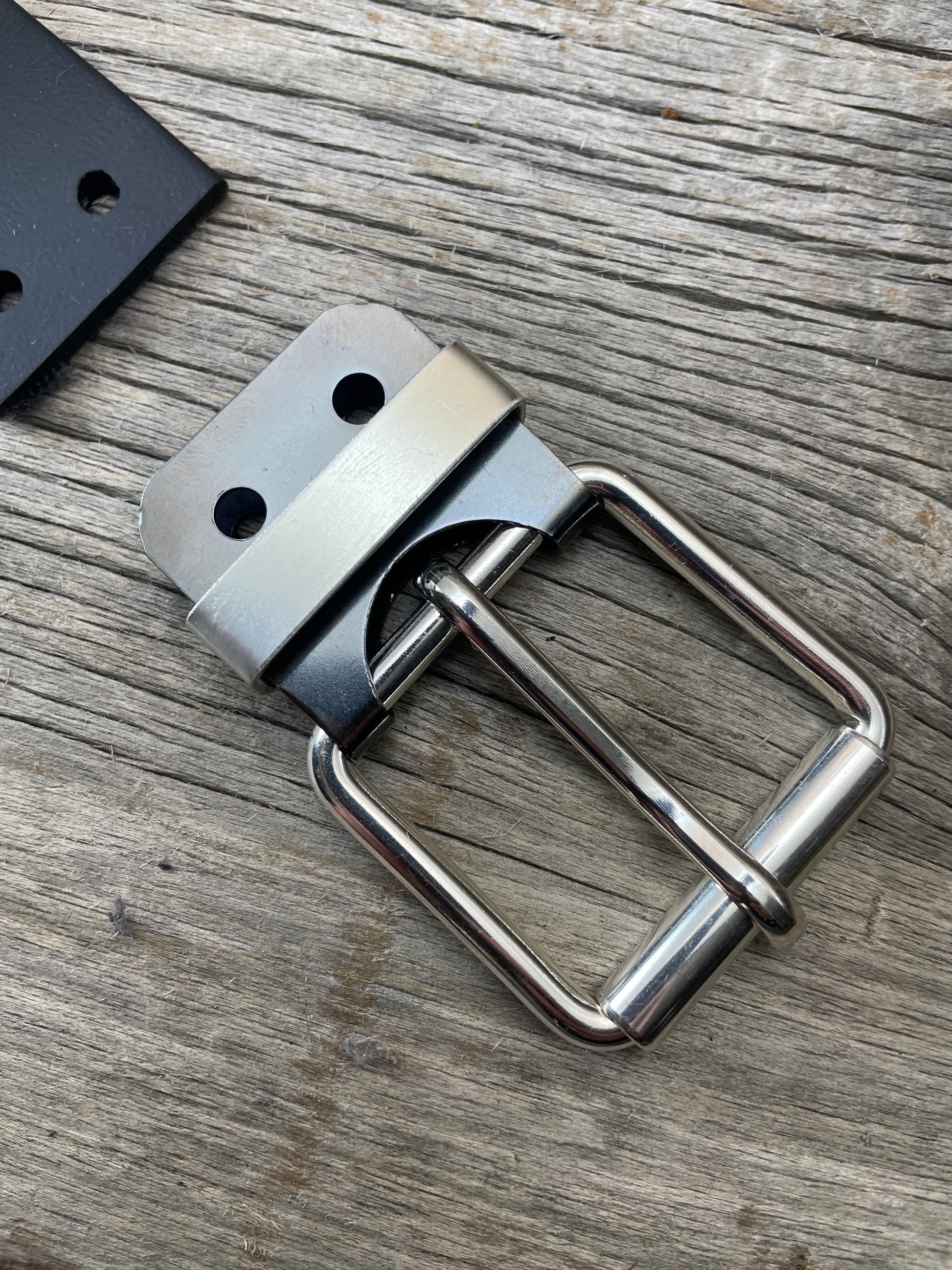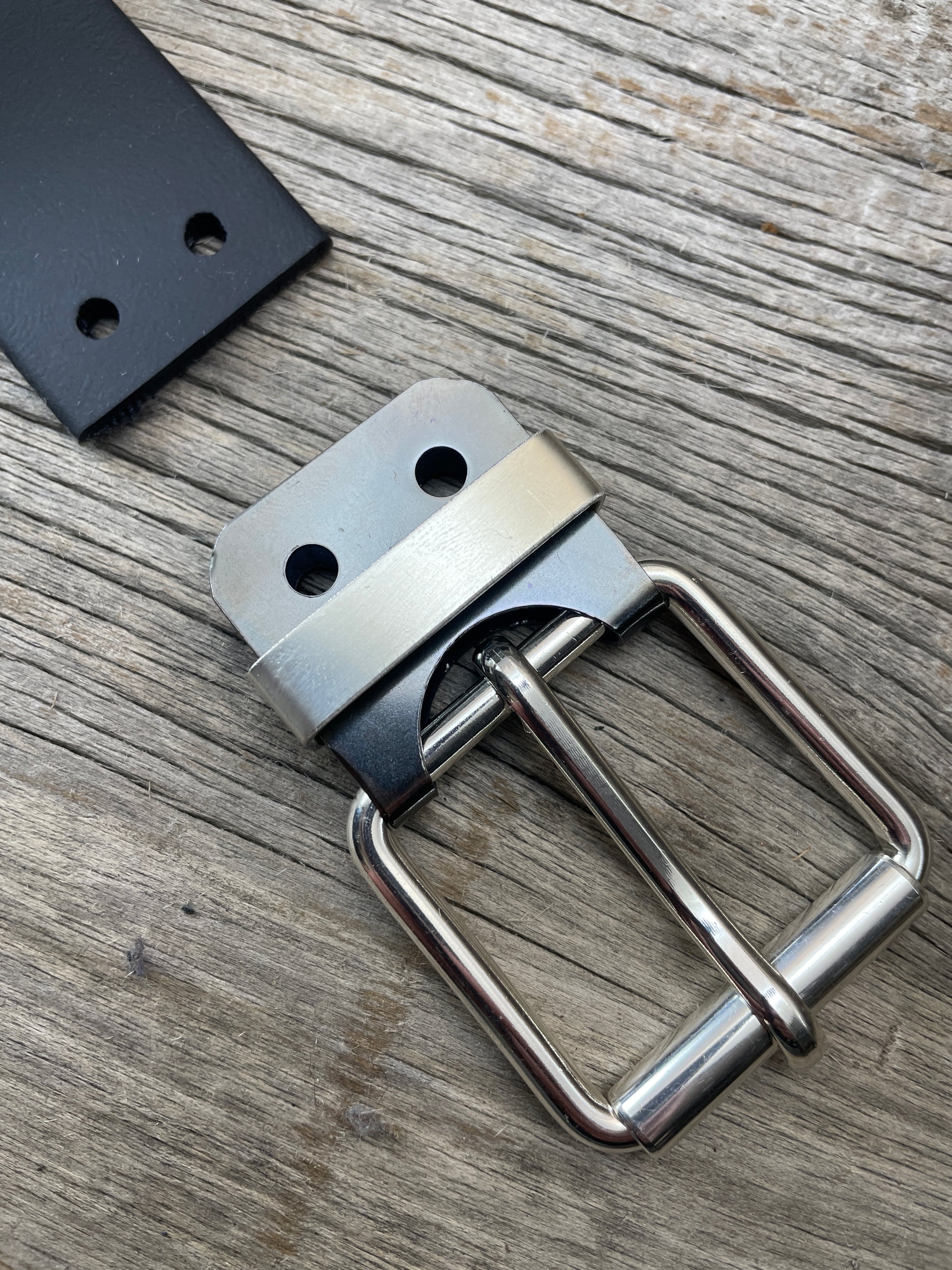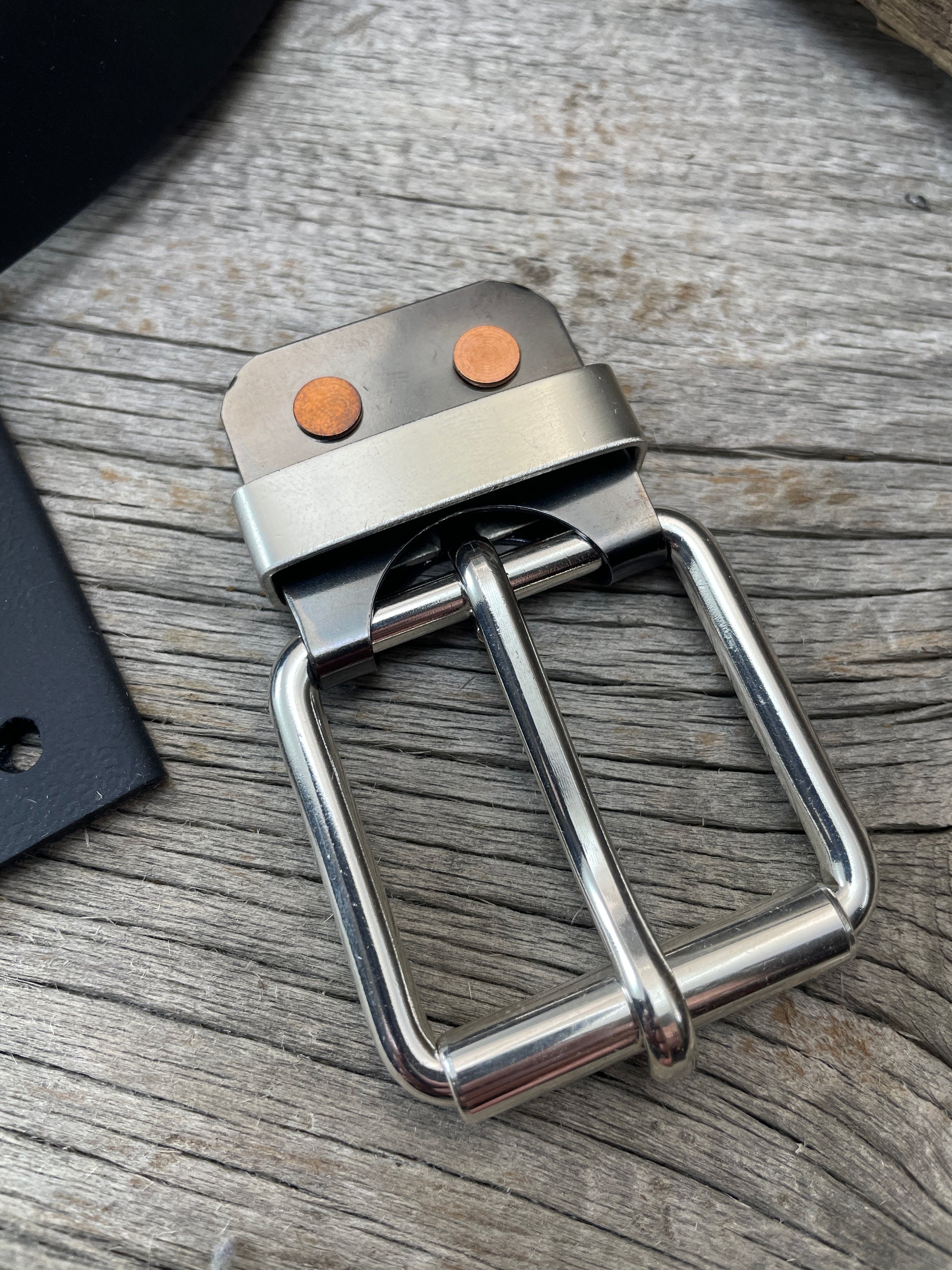 The roller buckle mounts to a belt-plate with a keeper inserted on the belt plate, fastened with Chicago screws. No stitching. No failure points. The result is a lower profile with increased comfort and flexibility. Its hinge function allows the buckle to move with the body, making it a very comfortable belt and buckle combination.